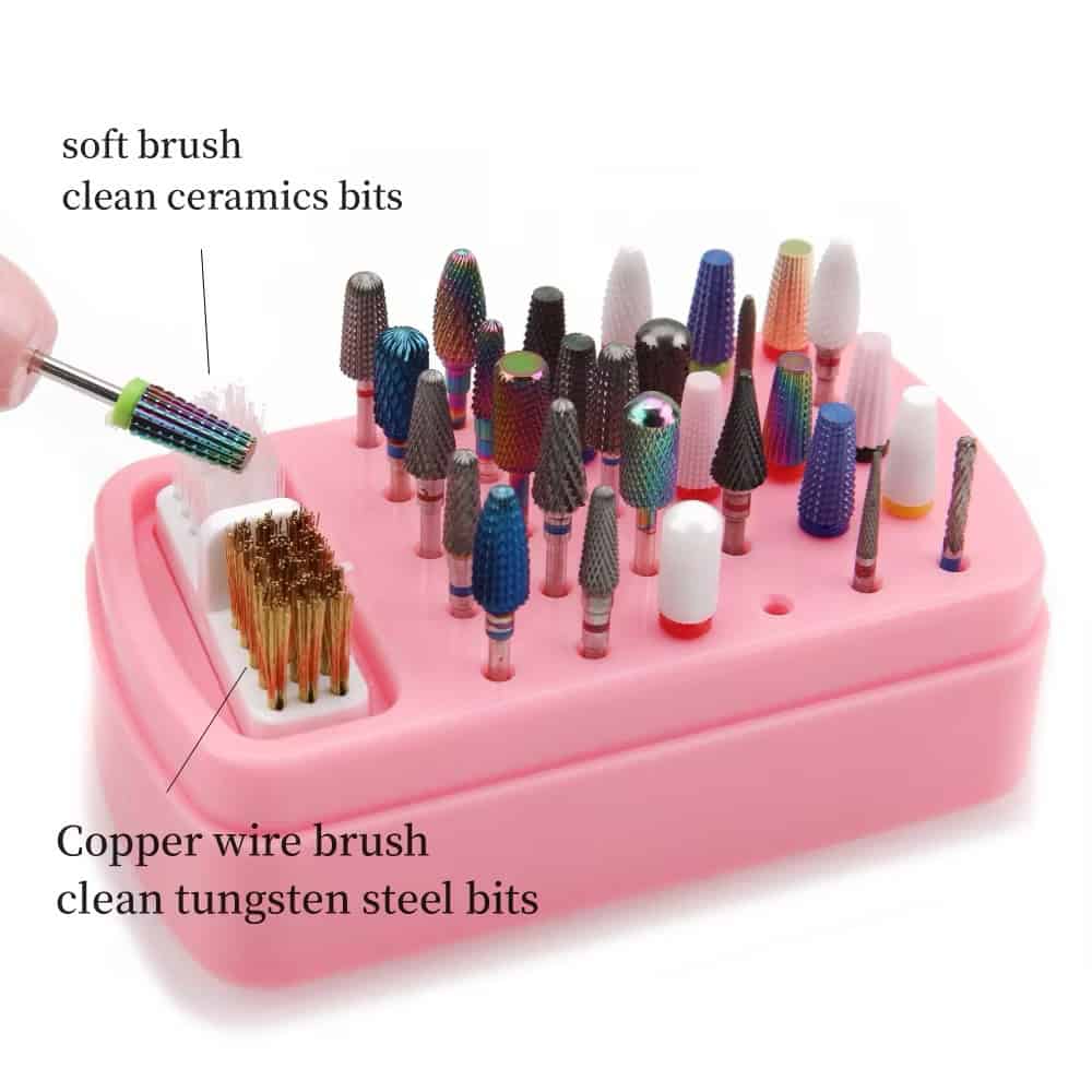 2. We combine the bits holder with the drill bits cleaner which equipped Steel Wire & Nylon Brushes. It is so convenient and effective to clean the nail drill bits.