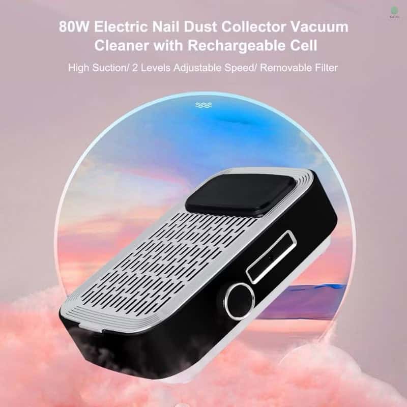 80W Electric Nail Dust Collector Vacuum Cleaner 2 Levels Adjustable Speed Nails Art Salon Tool with Strainer Mesh Built-in 2000mAh High Capacity Rechargeable Cell Portable