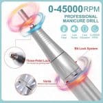 – The 0-45000rpm speed adjustable and positive inversion switch to effectively treat both delicate areas and rough callus.